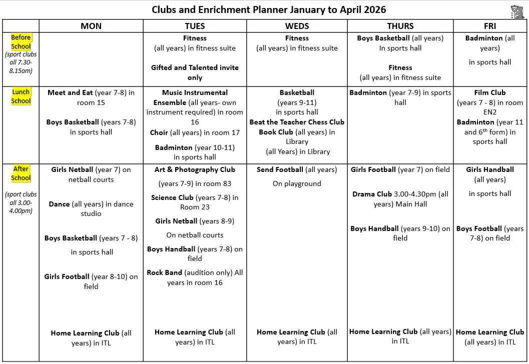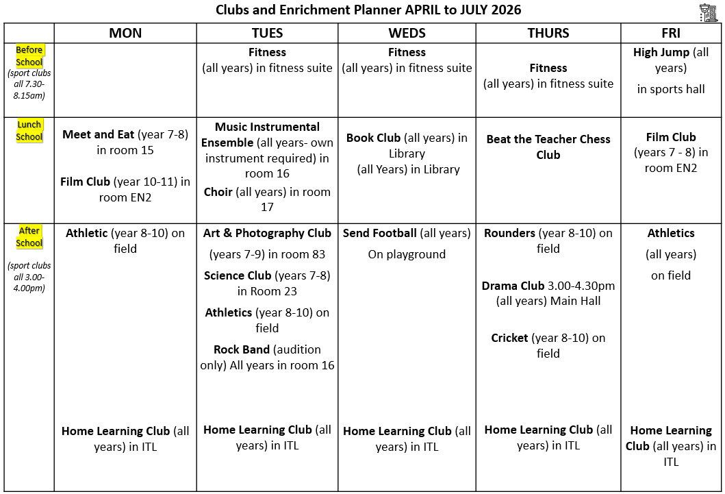We have a range of enrichment clubs & activities for students, including;